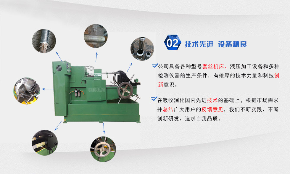 本套絲設備屬于無削加工設備,運用特殊的切削技術,上絲輕盈快捷,提高生產效率,采用三點一線,同心度高,性能穩定等優點,本機每分鐘可切削3-5根工件,速度快,效率高,對于一些不定長度的鋼結構公司,橋梁工程,電力設施等大企業的批量生產之需要。